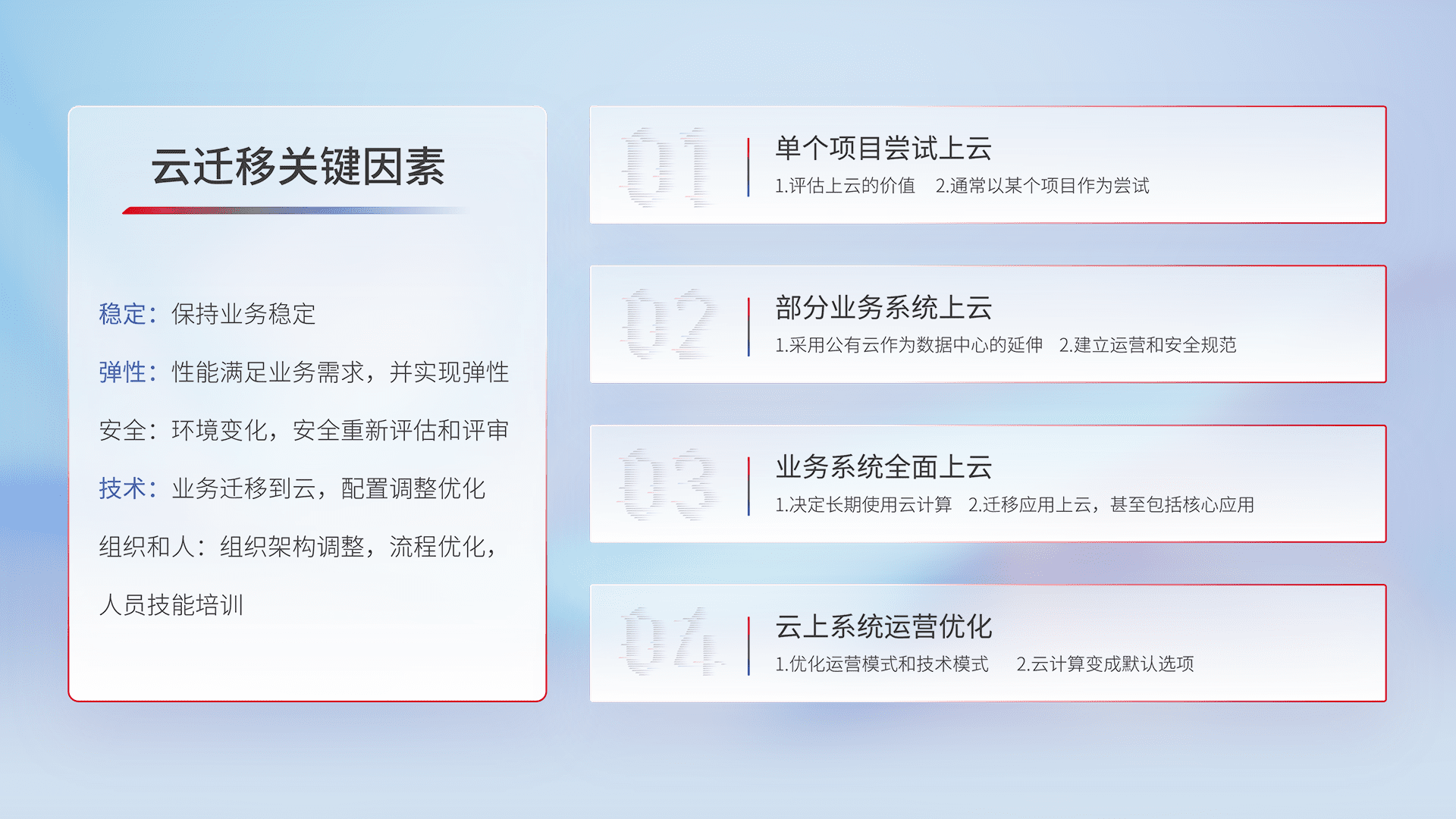 结合实际业务,,从规划设计、、、、云平台选型、、、、云原生改造、、、数据迁移、、、、集成交付,,迁移全过程为客户识别最佳上云路径,,做好风险识别管理,,,,设计网络架构、、、身份权限、、、安全审计合规、、、操作审计、、日志审计、、监控告警策略、、、、多站点容灾设计等,,,对云上基础设施进行整体规划,,,提升IT治理水平,,以满足弹性、、、高可用、、、高性能的需求。。