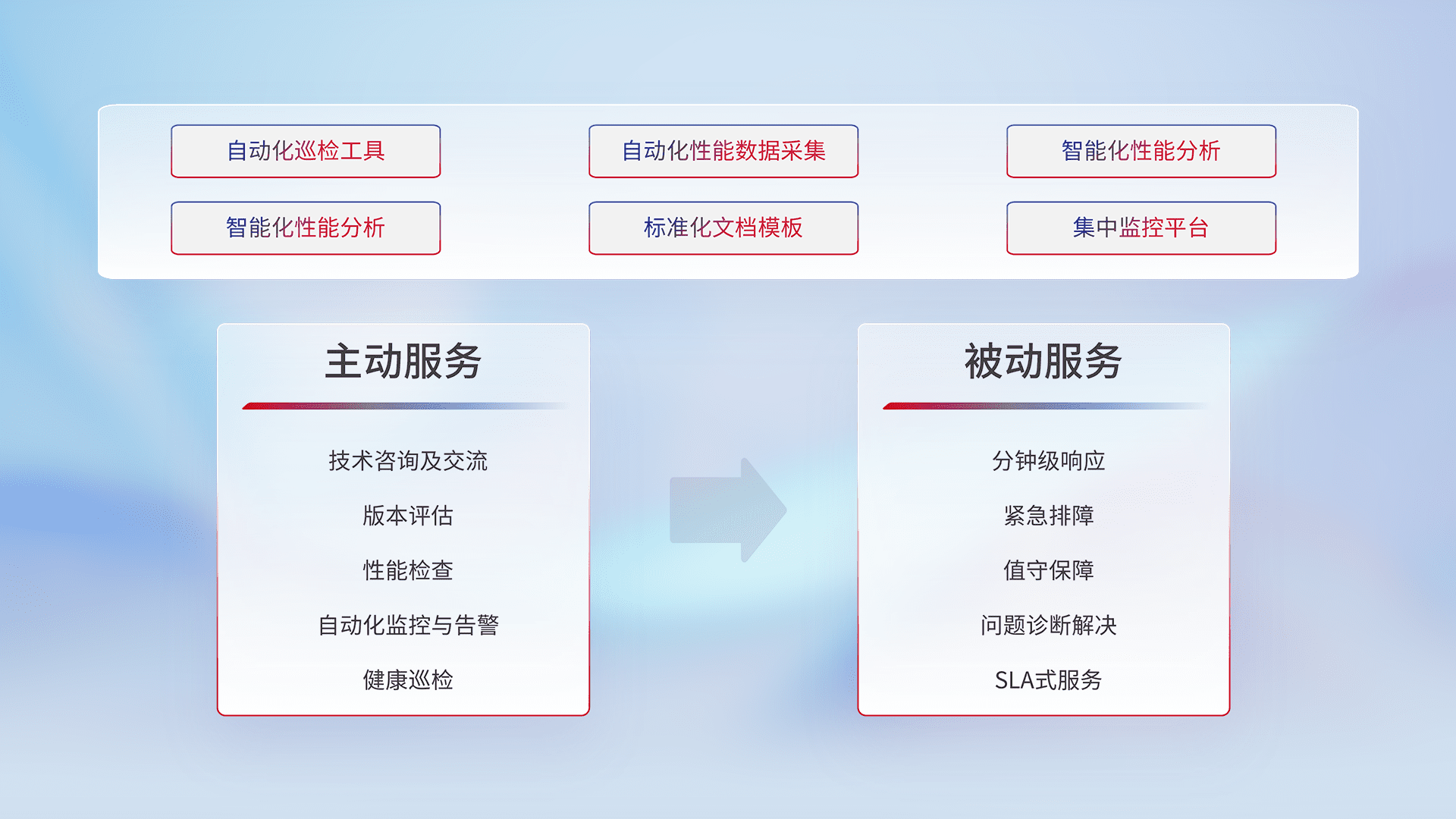 智能化工具和标准化文档,,保障服务质量,,,提供主动服务(包含技术咨询、、、版本评估、、、、性能检查、、、、自动化监控与告警、、、健康巡检)和被动服务包含(分钟级响应、、、紧急排障、、、、值守保障、、问题诊断解决、、SLA服务)。。。